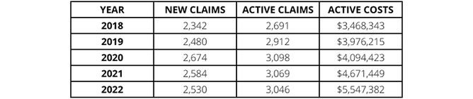 From 2018 to 2022, the number of new claims related to chainsaw injuries exhibited a fluctuating upwards pattern, ranging from 2,342 in 2018 to 2,530 in 2022. Similarly, the number of active claims saw a gradual upward trend over the years, starting at 2,691 in 2018 and reaching 3,046 in 2022. The financial impact of these injuries also experienced significant growth. Active claim costs (excluding GST) started at $3,468,343 in 2018, continued to rise in 2021, reaching $4,671,449, and peaked in 2022 at $5,547,382.